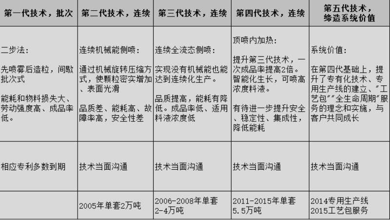 第一代技术:采用先喷雾后造粒的二步法,包括顶喷、底喷、侧喷式