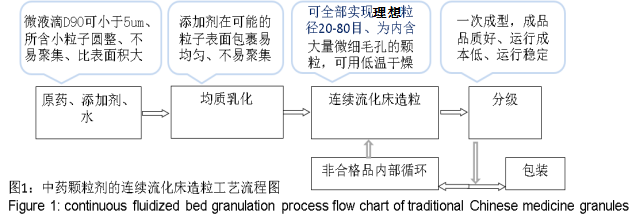 工艺有所简化,工艺路线为喷雾干燥—沸腾制粒—烘干—筛分—粉碎返回,批次生产导致工艺重复性差;此工艺也有常见的缺点,有时会添加较多辅料,出现提取精华—又大量添加没用的材料;沸腾制粒的单次一次成品率平均约70%,在沸腾制粒开始—中间—成品阶段,需要的流化风速不一样,造成运行风速难以控制、运行不稳定;加上喷雾干燥本来热效率就低,加上批次沸腾床的工艺,决定了成品普遍存在产量低、堆密度低、运行费用大、运行不稳定的固有特点;要想解决此工艺的缺点,可以考虑从原料液直接一步得到成品,但连续式流化床的工艺难度比较高,在之前不太成熟。