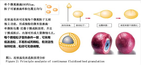 微液滴到成品颗粒的原理说明,如图2,全水溶性的物质,成粒原理也可参考。 原理分析:微米级乳化-微米级液滴雾化-单微粒包覆和预烘干-层叠包覆造粒-低温连续干燥成有大量微细毛孔的颗粒,结合低温操作和大量微细毛孔的存在,可让成品颗粒性能实现完美,符合理想颗粒剂的成品形态要求。