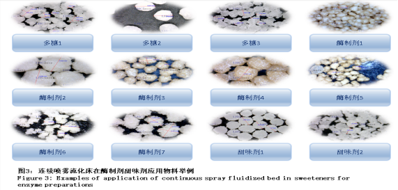 连续喷雾流化床在酶制剂、甜味剂应用物料举例,如图3。 连续喷雾流化床在配方中药、医药应用物料举例,如图4。